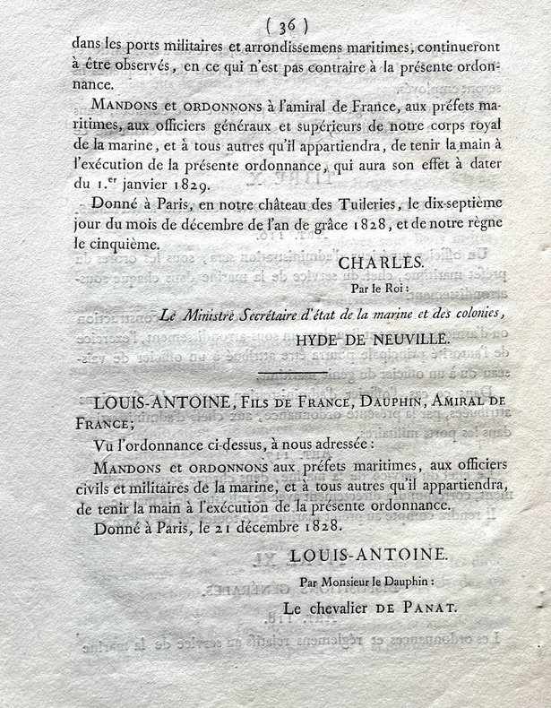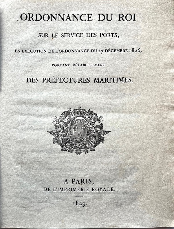 Rare exemplaire de lordonnance de Charles X du 27 décembre 1826 qui rétablis les préfectures maritimes et limite lindépendance de linspecteur. De nouveau désigné sous ce nom, ce texte le subordonne au préfet maritime et le charge dattributions administratives, évolution qui aboutit a lordonnance du 3 janvier 1835 : Linspection et ladministration sont réunies en un seul service a la tête duquel est placeŽ un commissaire général chargeŽ, entre autres attributions, de la surveillance jusqualors exercée par linspecteur. Cette organisation dont les défauts furent bientôt reconnus, le commissariat opérant plus pour le compte du préfet maritime dont il dépendait que pour celui du Ministre, ne devait subsister que neuf ans : lordonnance du 14 juin 1844 rétablit lInspection sous le nom de Contrôle et réaffirma son entière indépendance dans lexercice de son rôle. Inscription manuscrite à l'encre brune sur la couverture: "était joint à la lettre du commissaire chef maritime à St Servan en date du 18 may 1829..." Bel exemplaire, très frais. 1 vol. 4to (246 x 200 mm) of: 36 pp. Handwritten inscription in brown ink at the top left of the front cover. Original binding, blue paper cover. Rare copy of Charles X's ordinance of December 27, 1826, which reestablished the maritime prefectures and limited the independence of the inspector. Renamed under this title, this text subordinates him to the maritime prefect and assigns him administrative duties, a development that culminated in the ordinance of January 3, 1835: Inspection and administration were combined into a single service headed by a commissioner general responsible, among other duties, for the supervision previously exercised by the inspector. The shortcomings of this organization were soon recognized, as the commissariat operated more on behalf of the maritime prefect to whom it reported than on behalf of the Minister, and it was to last only nine years: the ordinance of June 14, 1844, reestablished the Inspection under the name of Control and reaffirmed its complete independence in the exercise of its role. Handwritten inscription in brown ink on the cover: was attached to the letter from the chief maritime commissioner in St Servan dated May 18, 1829... A fine copy, very fresh.